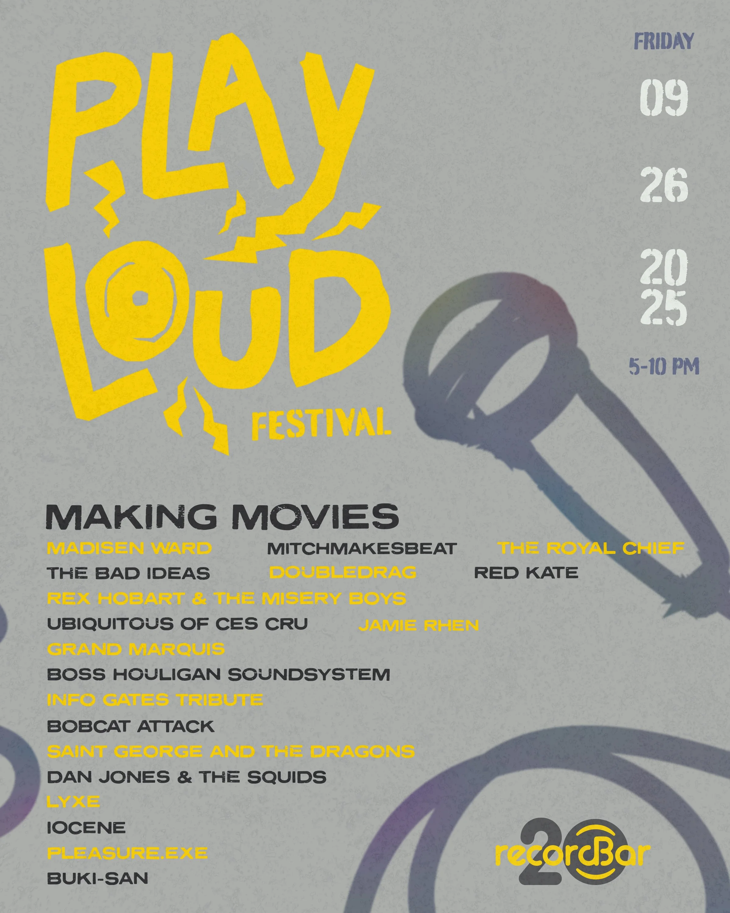 To celebrate 20 years of live music, recordBar held a festival called Play Loud, bringing back some of the acts that helped get recordBar to where it is today. Small bands local to Kansas City as well as local-turned-national acts were brought together at the venue for the last weekend of September 2025. I created a set of branding materials to celebrate both their 20th anniversary and the Play Loud Festival.